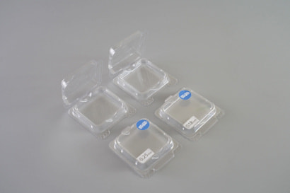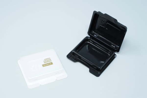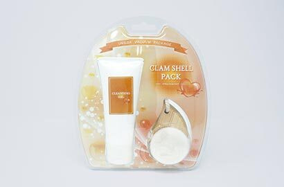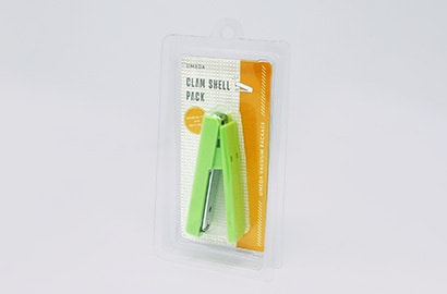 前面部と背面部が一体成形されたカバーに商品を挟み込む形態のパッケージです。一体構造で強度があり、前面・背面の両側から商品が見える利点があります。